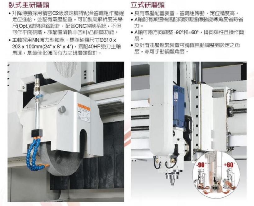 福裕FPG-DC系列动梁式导轨磨床,简易操作接口,全功能友善操控系统,加工范围广,可实现高刚性高精度之加工表现。福裕之升降轨道与主轴座机构设计,含高负荷之四线方形导轨,提供絶佳的刚性及重切削轮磨加工能力。Y轴之硬轨表面硬化热处理并经精密研磨,高宽度之导轨活动面贴附Turcite-B抗磨擦介质再施以手工铲花,使主轴头之运行更稳定平滑。