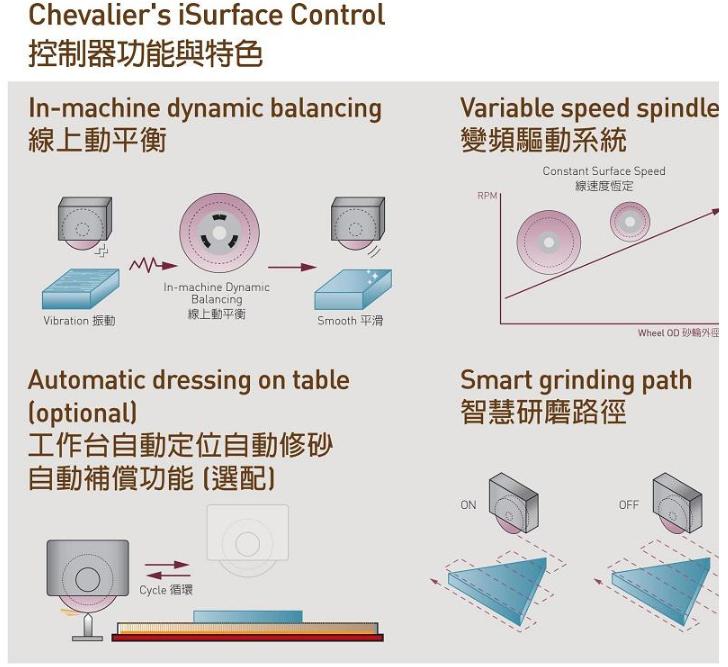 FSG-2048/2064ADIV智慧數控磨床的核心是iSurface控制器,擁有創新的手動線上動平衡、變頻驅動系統、加工砂輪線速度恆定、工作台自動定位、自動修砂自動補償及智慧研磨路徑功能,讓使用者在研磨加工時,能輕鬆完成設定,提高生產效率,大幅提升福裕數控平面磨床的磨削性能。